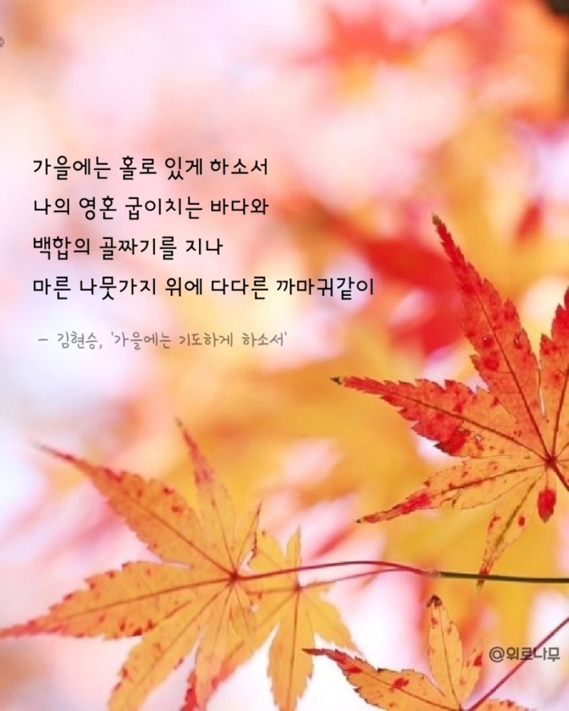누구나 낙엽 지는 가을이 오면 자신의 인생을 돌아보는 시간을 갖게 마련입니다. 계절의 순환이 어김없이 돌아오듯 인생의 마지막 순간도 누구나 맞게 됩니다. 그래서 좀 더 사색하게 되고 일상의 일이 아니라 영원에 대한 생각을 품게 되는가 봅니다. 시인은 그 가을의 문턱에서 겸허하게 절대자를 추구하며 기도합니다. 그리고 그 기도는 한 사람을 향한 사랑이 되기를 소망하며 깊이 있는 내면의 성찰을 간구합니다.